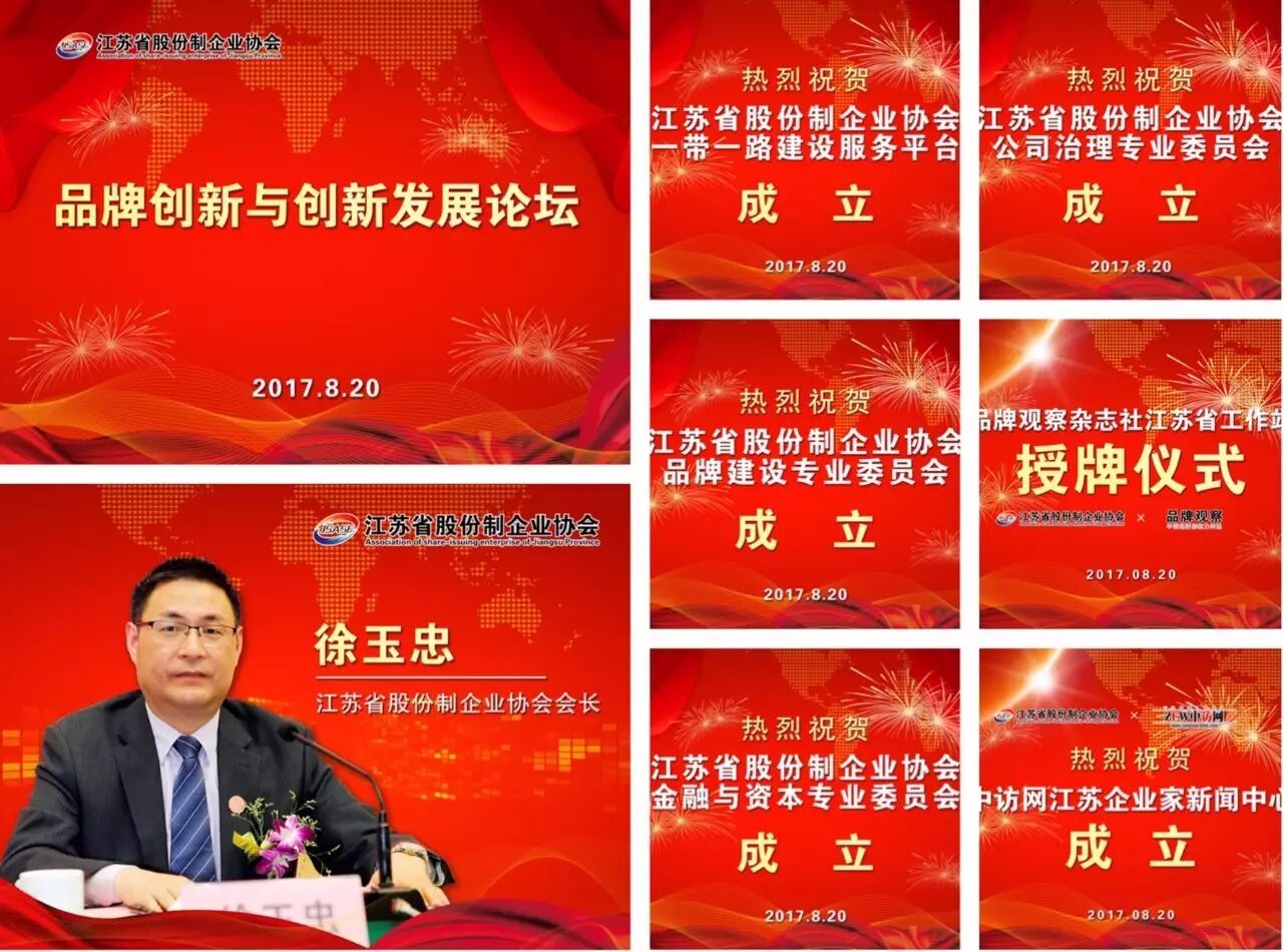 江苏省股份制企业协会徐玉忠会长发表“品牌创新与创新发展”主旨讲话,在讲话中重点强调了创新的重要性,突出“抓创新就是抓发展,保创新就是保未来”,并宣布“江苏省股份制企业协会一带一路建设服务平台”、“江苏省股份制企业协会品牌建设专业委员会”、“江苏省股份制企业协会金融与资本专业委员会”和“江苏省股份制企业协会公司治理专业委员会”成立。